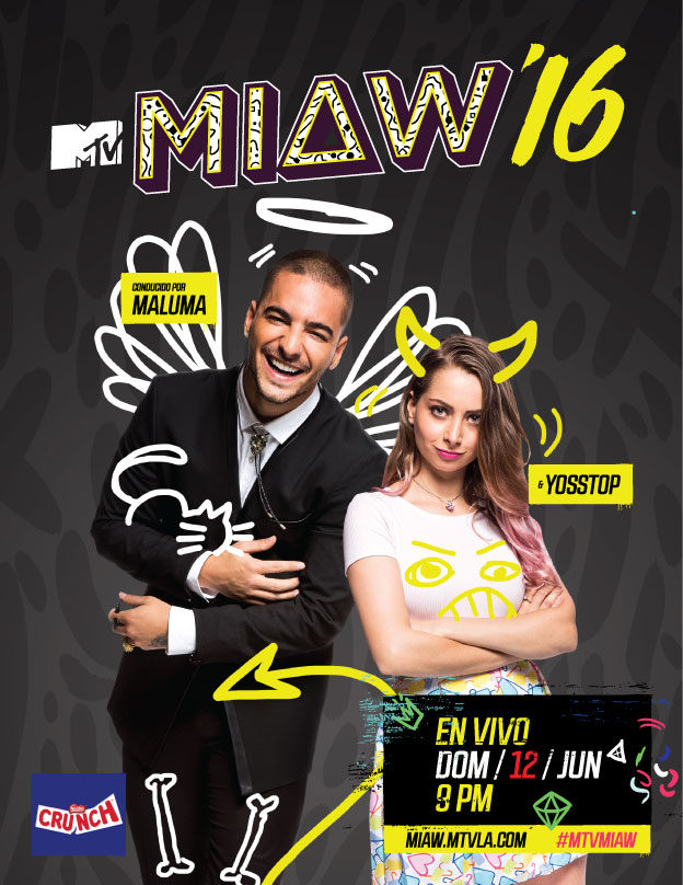 Ciudad de México. 9 de mayo, 2016. El ídolo juvenil y el artista más nominado de los MIAW’16 Maluma, y la también nominada y estrella del mundo digital YosStop serán los anfitriones de la cuarta edición de los premios MTV MIAW (#MTVMIAW). El show se transmitirá por MTV Latinoamérica desde el Pepsi Center de la Ciudad de México por primera vez en vivo el domingo 12 de junio a las 9pm (México y Colombia), 10pm (Venezuela) y 11pm (Argentina). Los MTV MIAW’16 celebran lo más sonado en cultura pop, el mundo digital, televisión, música y redes sociales y contarán con actuaciones musicales en vivo, así como la asistencia de estrellas virales, las personalidades más ‘likeadas’ del mundo digital y más celebridades que serán anunciadas próximamente.